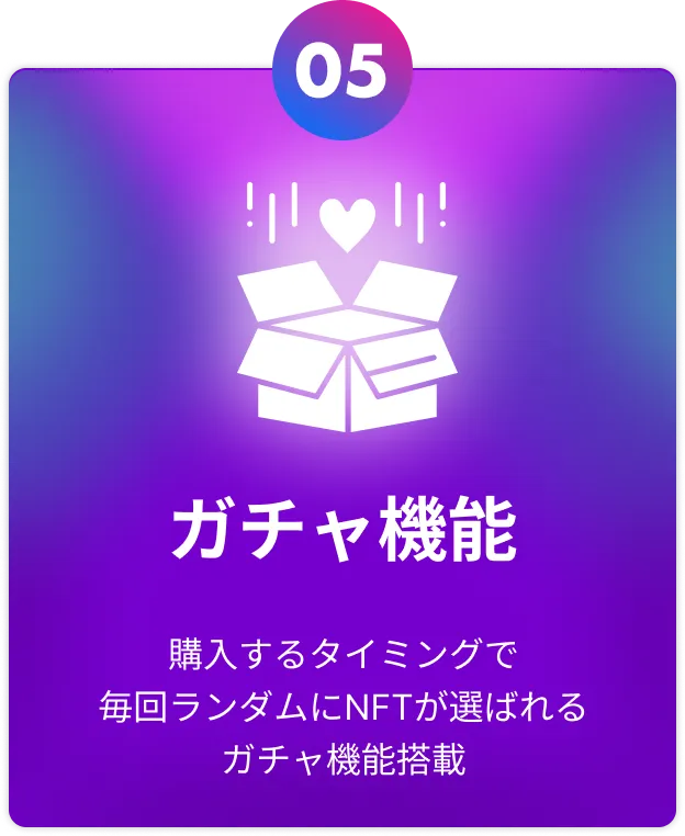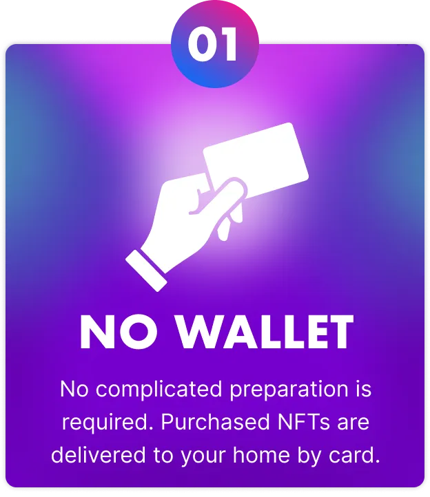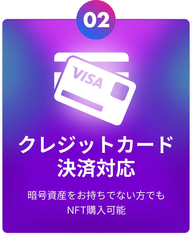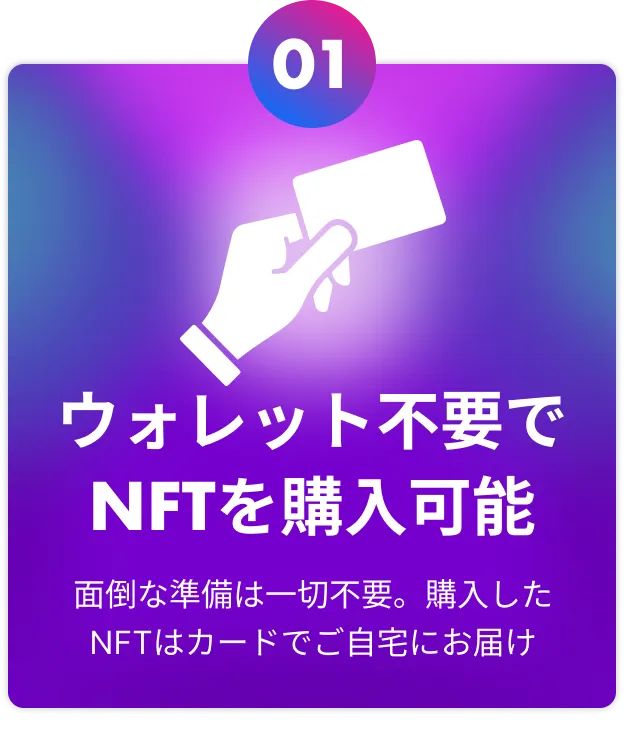 また、ウォレットをお持ちでない方、暗号資産をお持ちでない方でも簡単にNFTを購入いただけるように、カード型NFTの販売(購入頂いたNFTはカード型NFTとしてご自宅にお届け)、クレジットカード決済を導入しております。